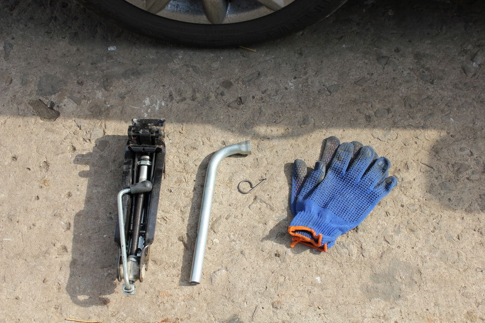домкрат + балонник + колечко для декоративніх колпачков на болтах + перчатки + ключ рожковый на 13 и ключ рожковый на 15